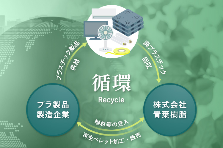 私たちは廃材となったプラスチックを回収・加工し、原料として新しい価値を与え 企業に供給することで環境保全と資源循環の一助になることを目指します。